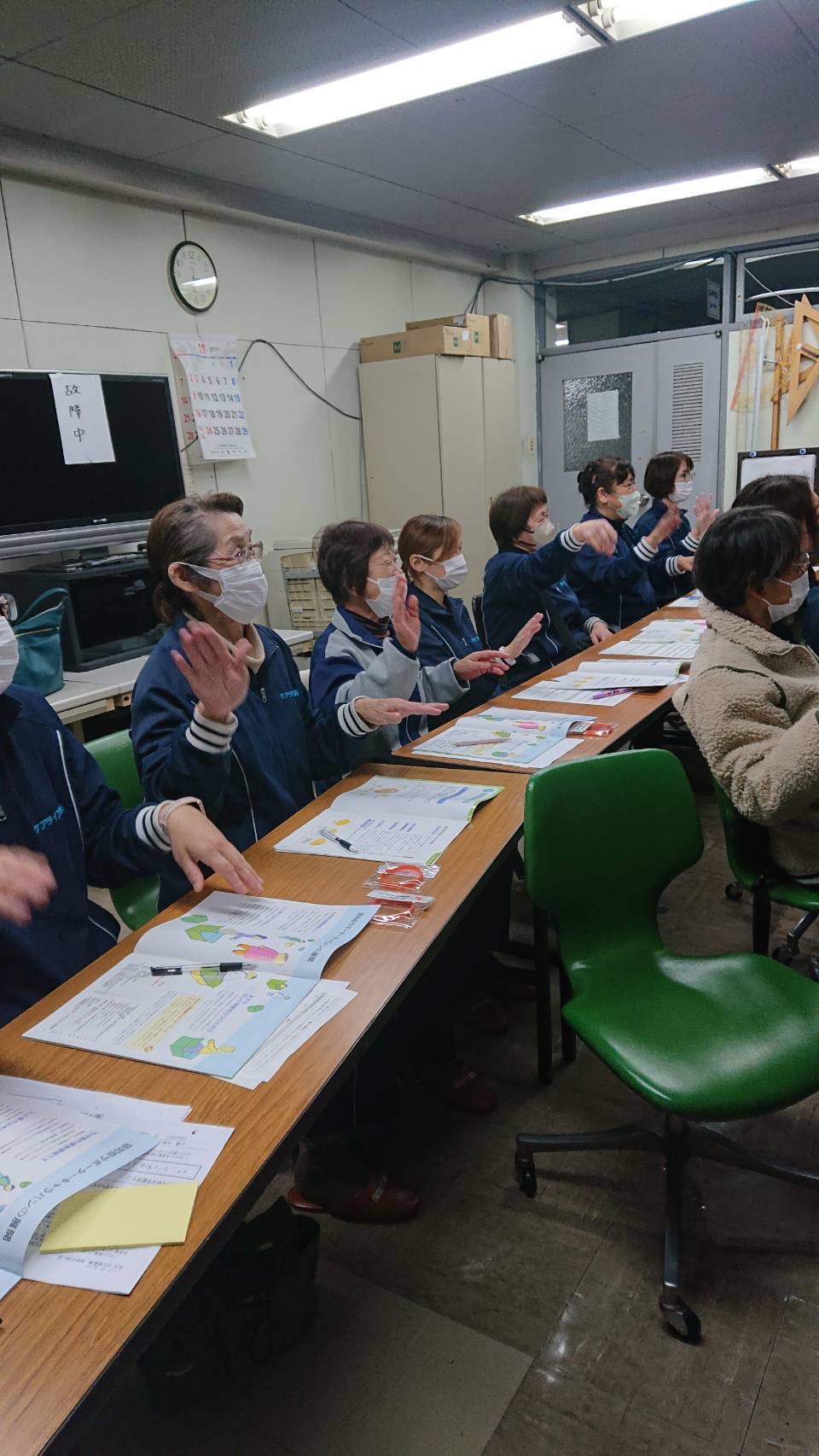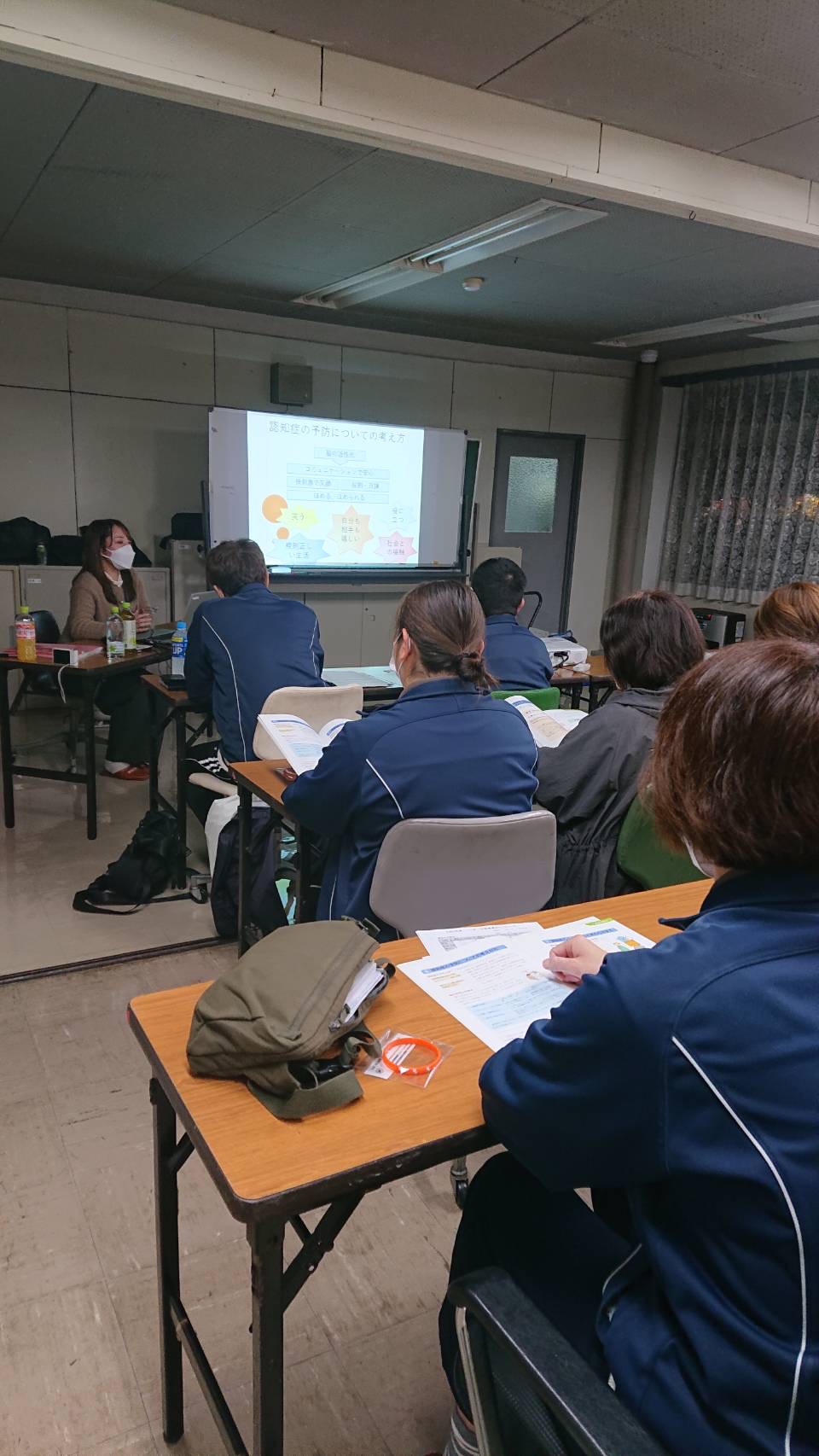 講師はむつ市地域包括支援センターの玉谷様、木村様、小田様の3名。途中、歌に合わせた体操をはさみながら楽しく学び、受講後は認知症サポーターとしての証、オレンジリングをいただきました。