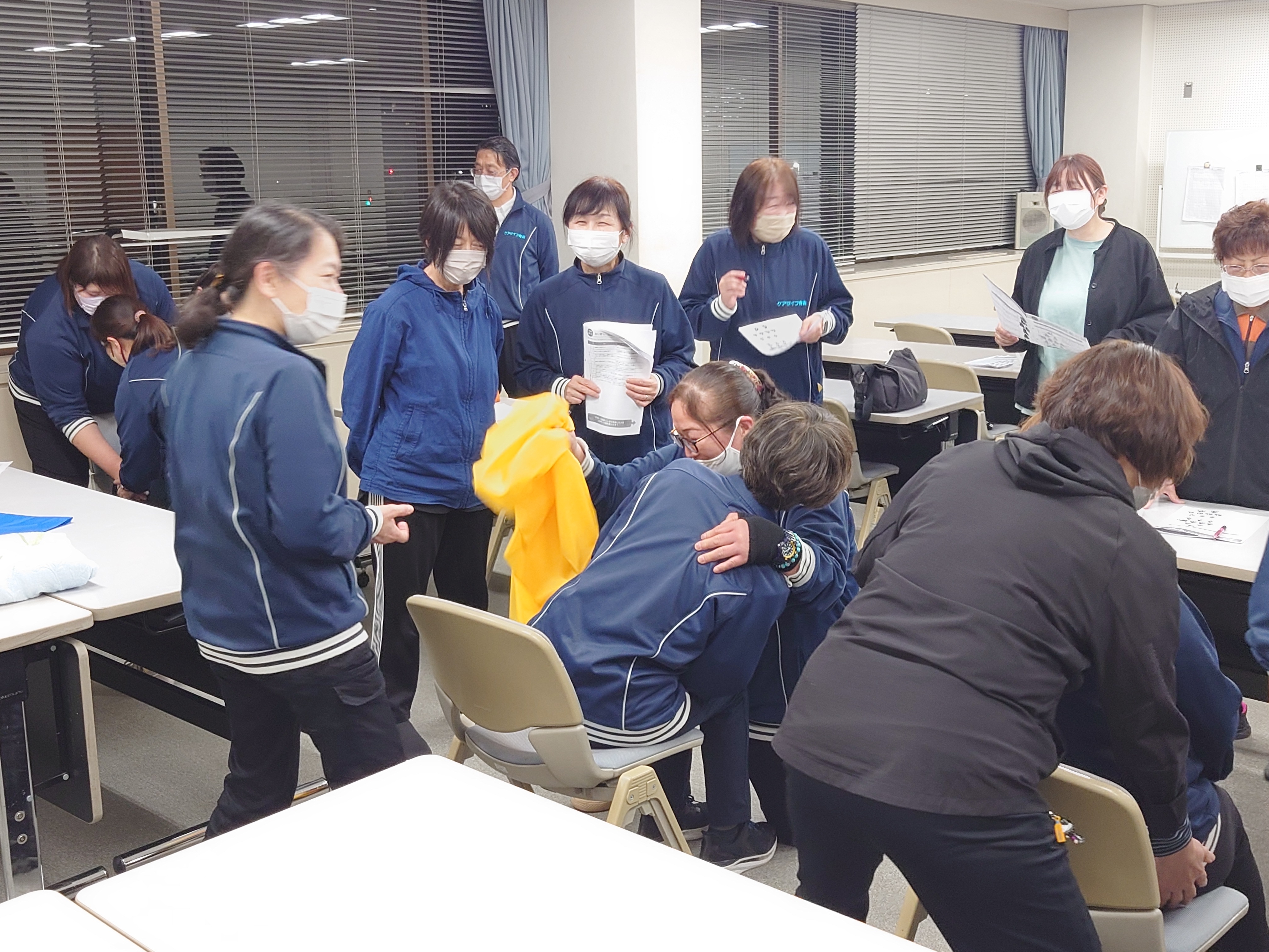 今回の研修では、ベッド上や椅子でのスライディングシートの使い方を実技で学びました。